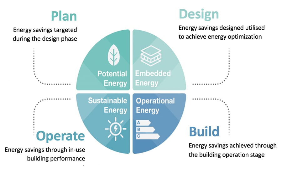 There are four segments within the energy life cycle in construction: Potential, Embedded, Operational, and Sustainable energy. These four segments together account for all of the energy used in the complete construction life cycle and are mutually dependent and, therefore, cannot be considered separately. Decisions and actions are not mutually exclusive – decisions made within one segment have significant impacts across the entire energy circle.