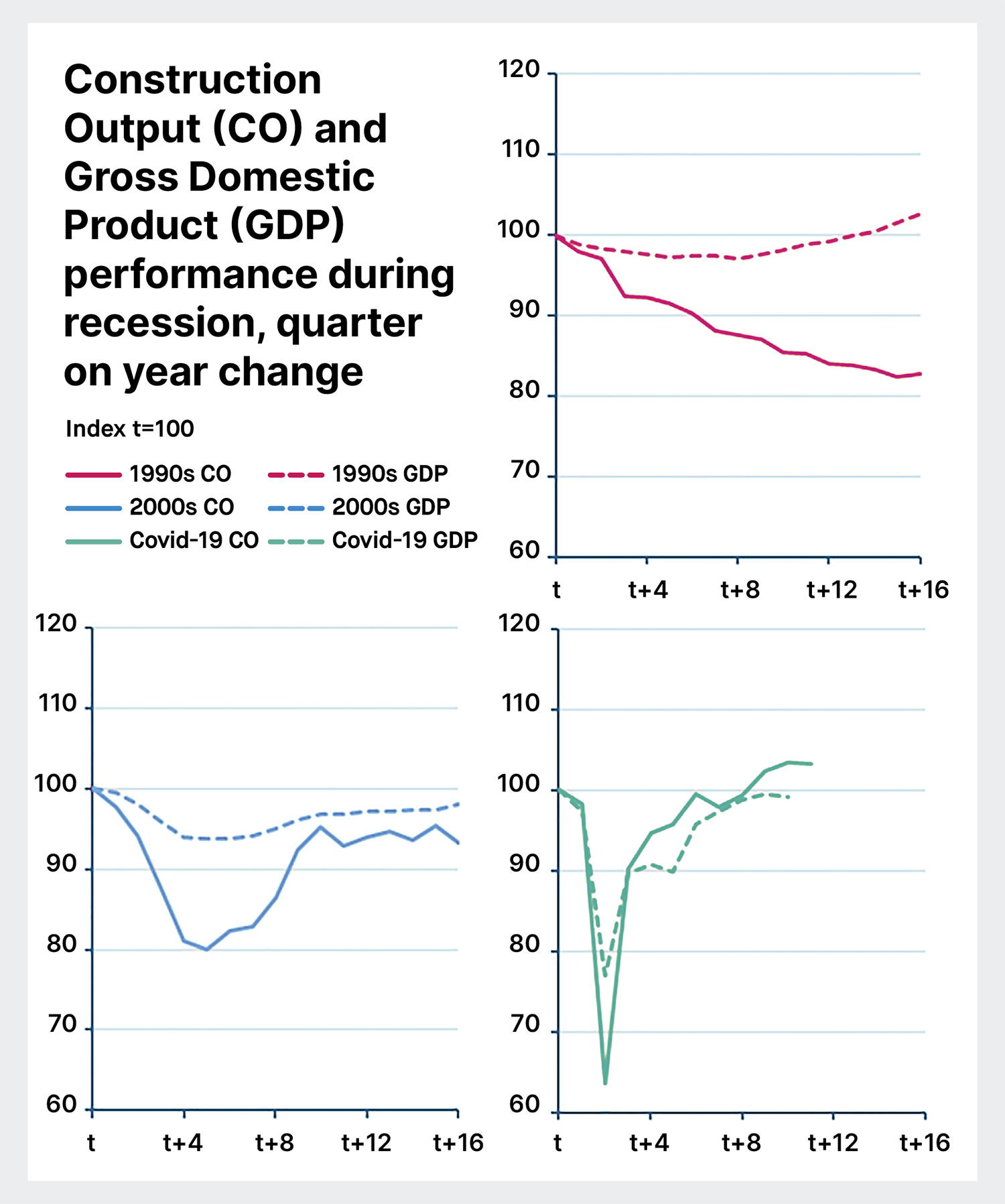 In all previous downturns where data is available, construction output growth has reduced ahead of recessions. It usually falls more than GDP but grows faster and further afterwards – often providing a key driving force to help sustain economic recovery. For example, in the 2000s recession, quarter on year growth of construction output fell to -19.0% while GDP dropped to only -5.9%. But in the recovery, fortunes reversed, and construction grew to 15.6% against GDP’s 3.1%.