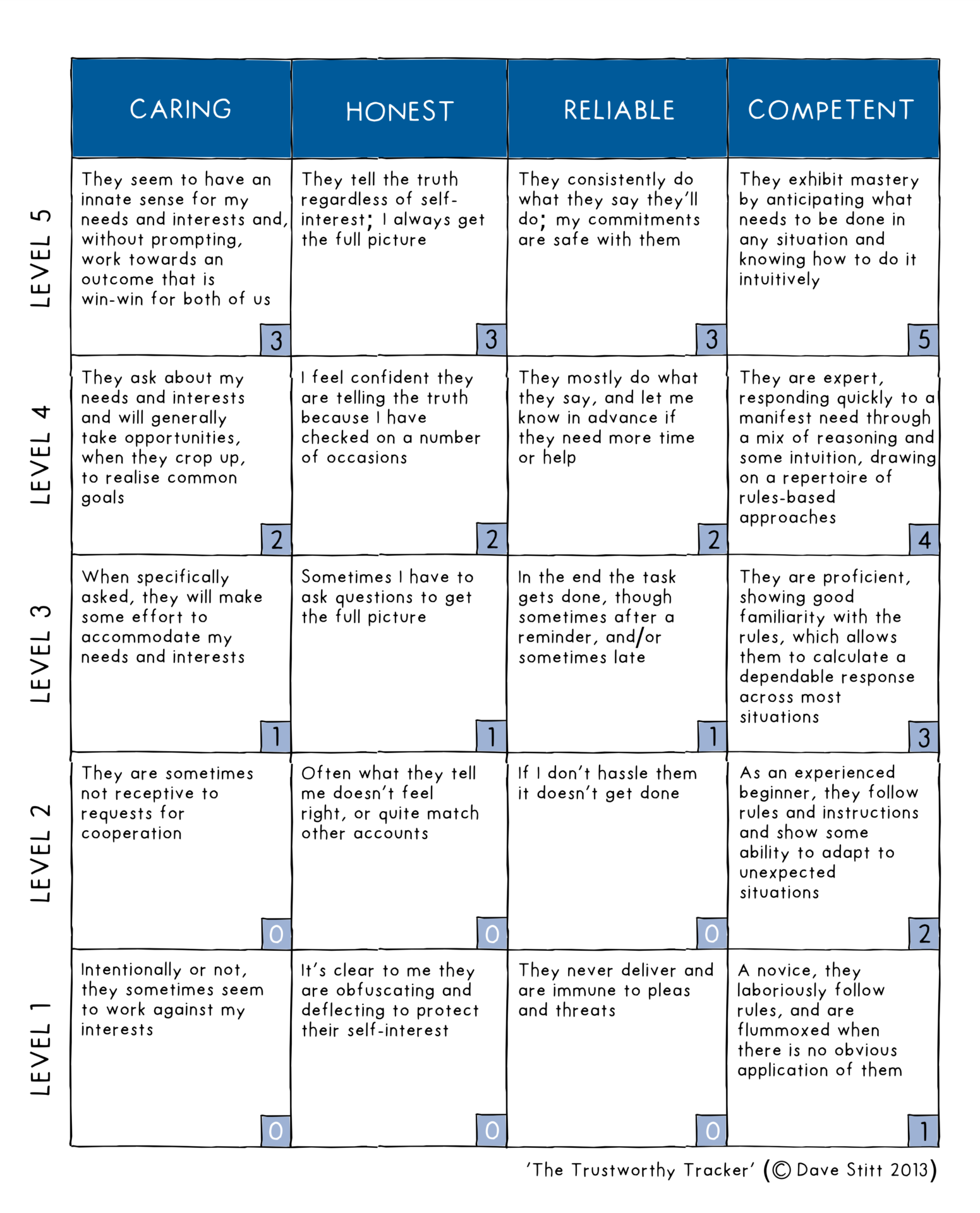 Each element has five levels ranging from not trustworthy at the bottom to very trustworthy at the top. For each element, you pick the statement that best describes the person in relation to the thing you’re considering entrusting them with, then multiply the four scores together to arrive at the overall trustworthiness score. Possible scores range from zero to 135.