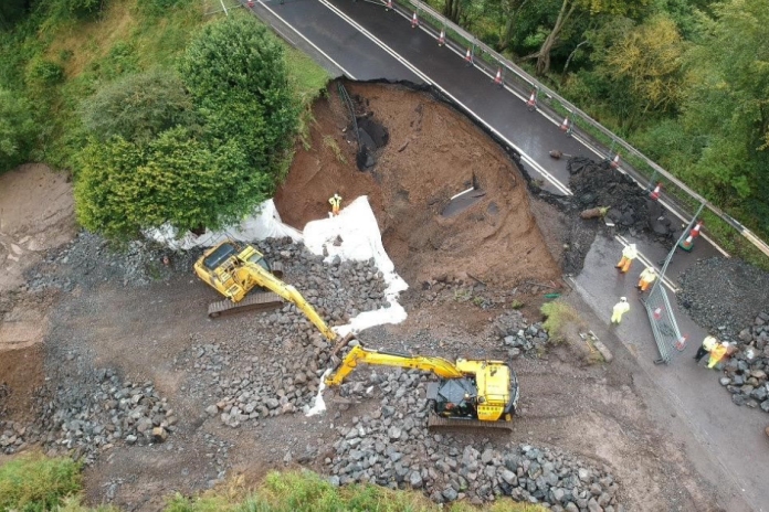 A 20m-high embankment collapsed, leaving a large gap in the carriageway. Road maintenance firm Bear Scotland cleared and stabilised the site and used an estimated 5,000 tonnes of rock to rebuild the embankment.