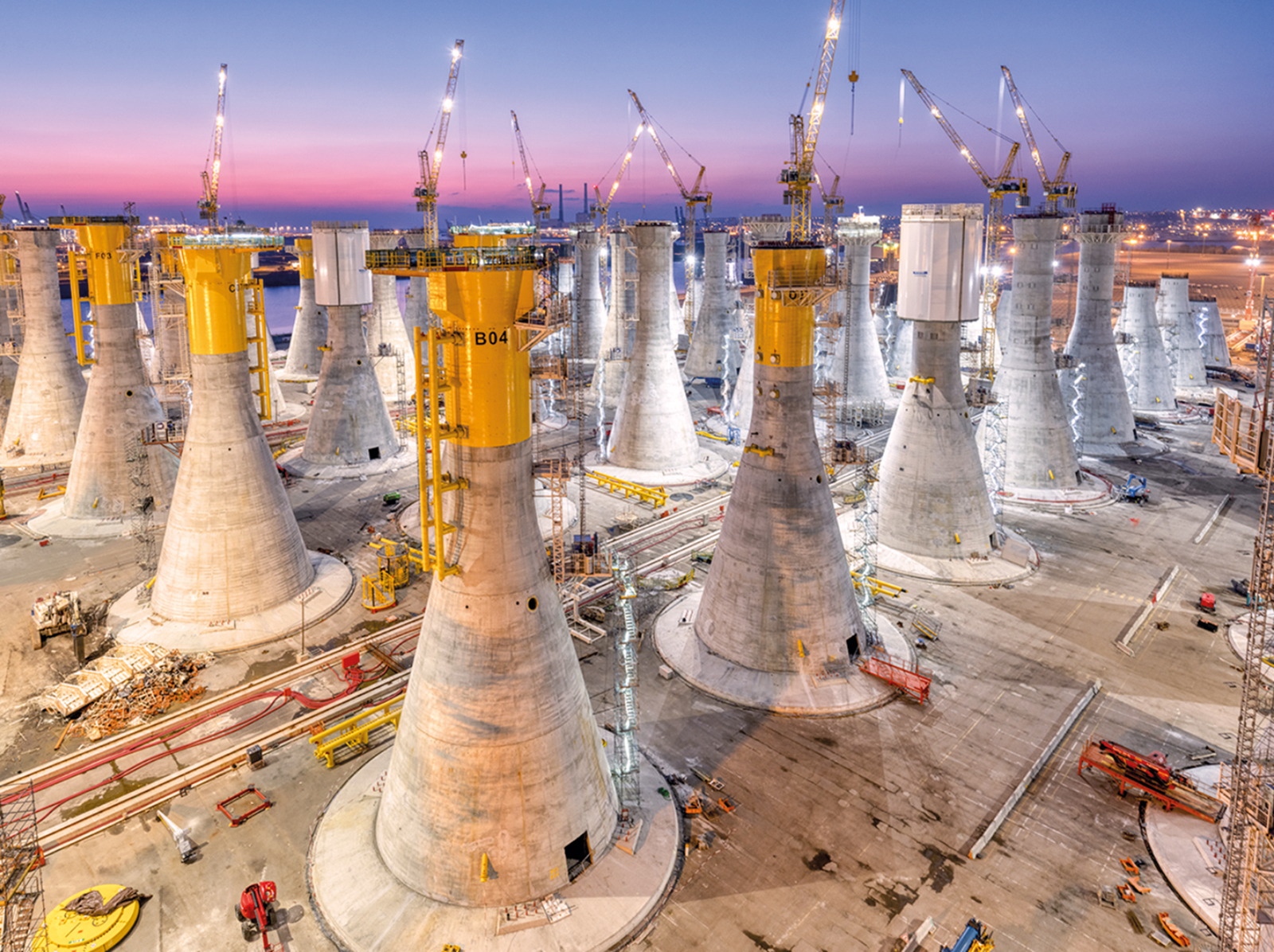 A consortium of Bouygues, Saipem and Boskalis designed, built and installed the 71 wind turbine bases of France’s first offshore wind farm in Normandy.