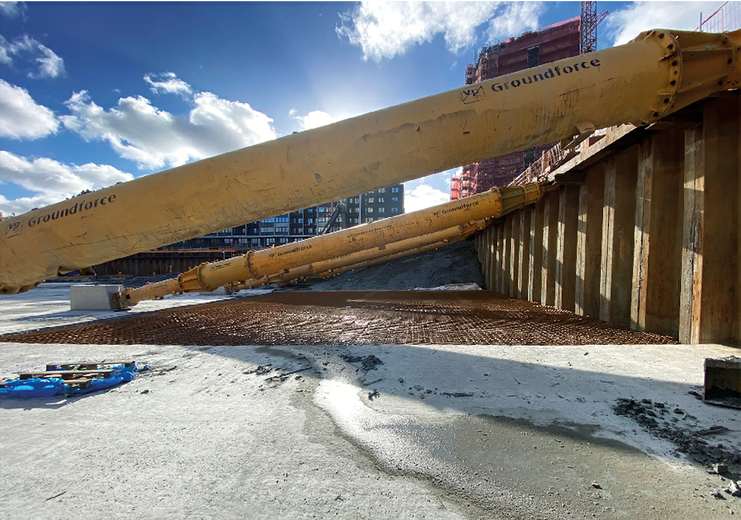 Groundforce has supplied 12 of its heavy-duty MP250 modular hydraulic props to support excavation of the foundations for the Swedish city of Gothenburg’s first skyscraper. The 245m-tall tower excavation is 90m in length, and 90m wide, to a depth of 6m on a sloping site.