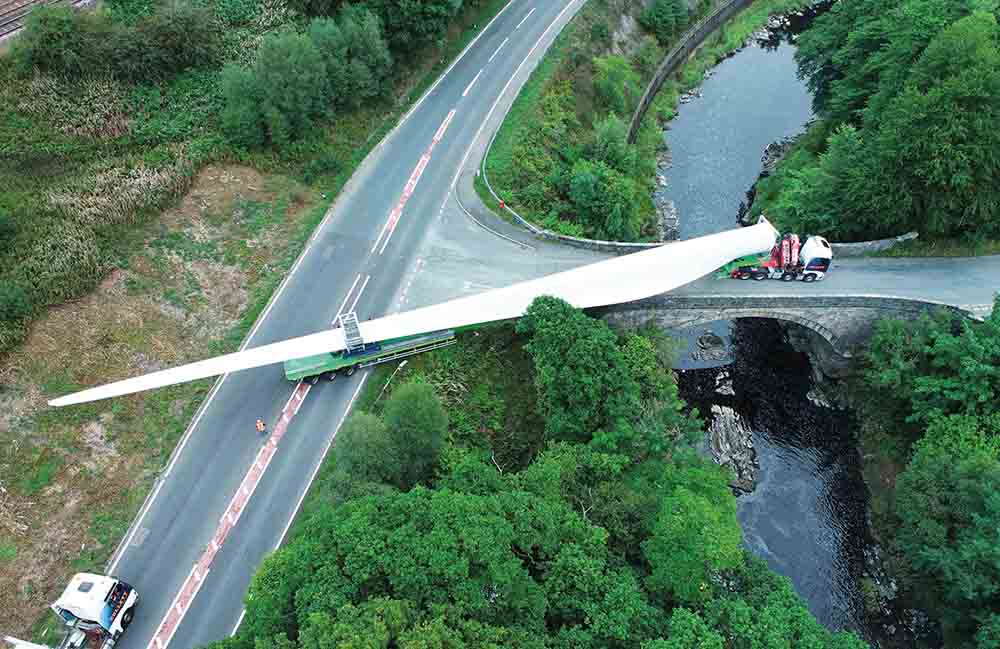 Huge components for nine wind turbines have been delivered to Twentyshilling Wind Farm in Sanquhar, Dumfries and Galloway, Scotland. Haulage firm Collett & Sons transported components, including a total of 27 57m-long blades, 170 miles to the site. The company had to create a turning head two miles from the site on approach to the wind firm to give the required clearance for the blades to be delivered safely.