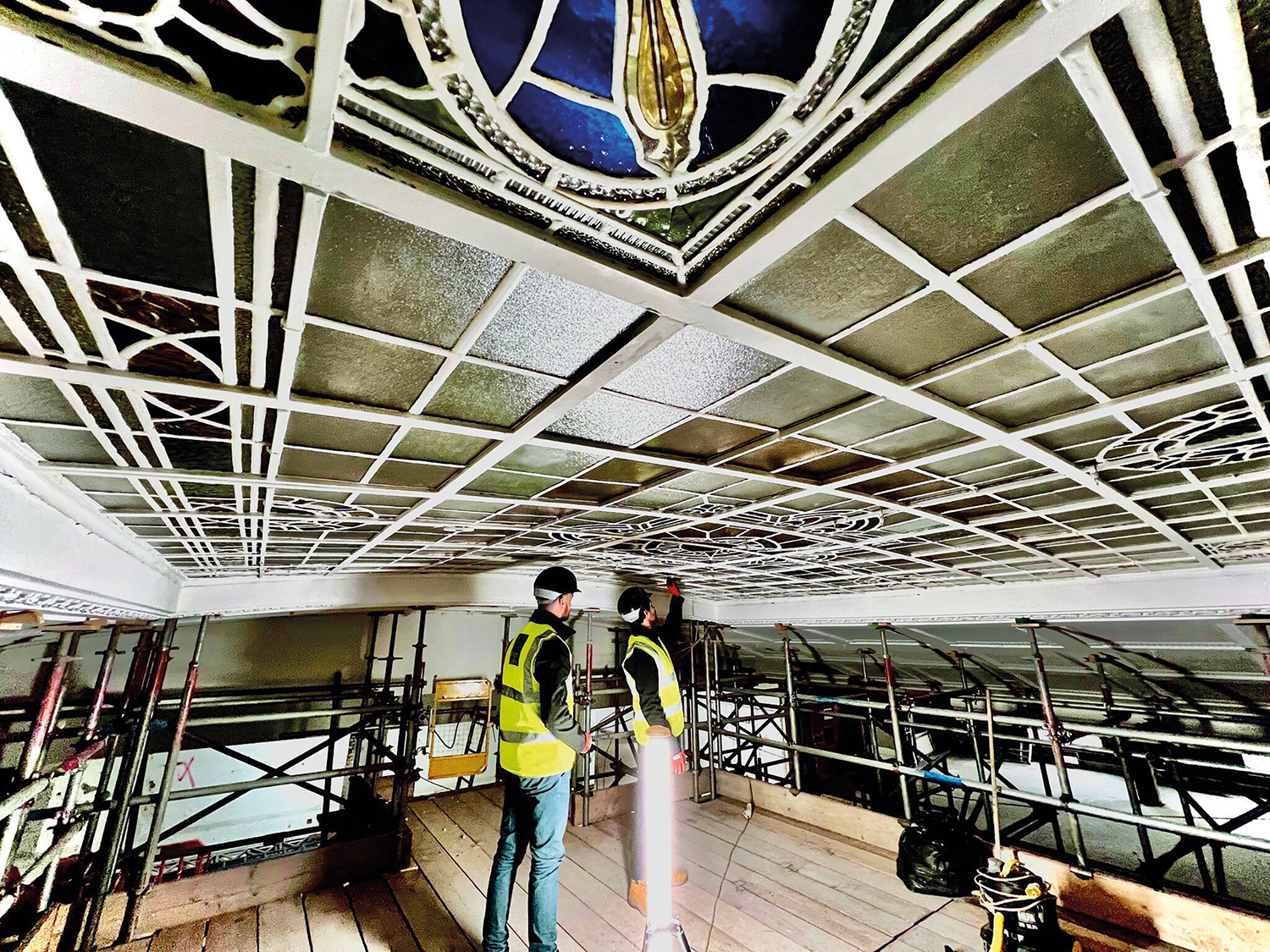 Conservationists from Easthope Stained Glass Studios are restoring the intricate glass work using vinegar and toothbrushes.