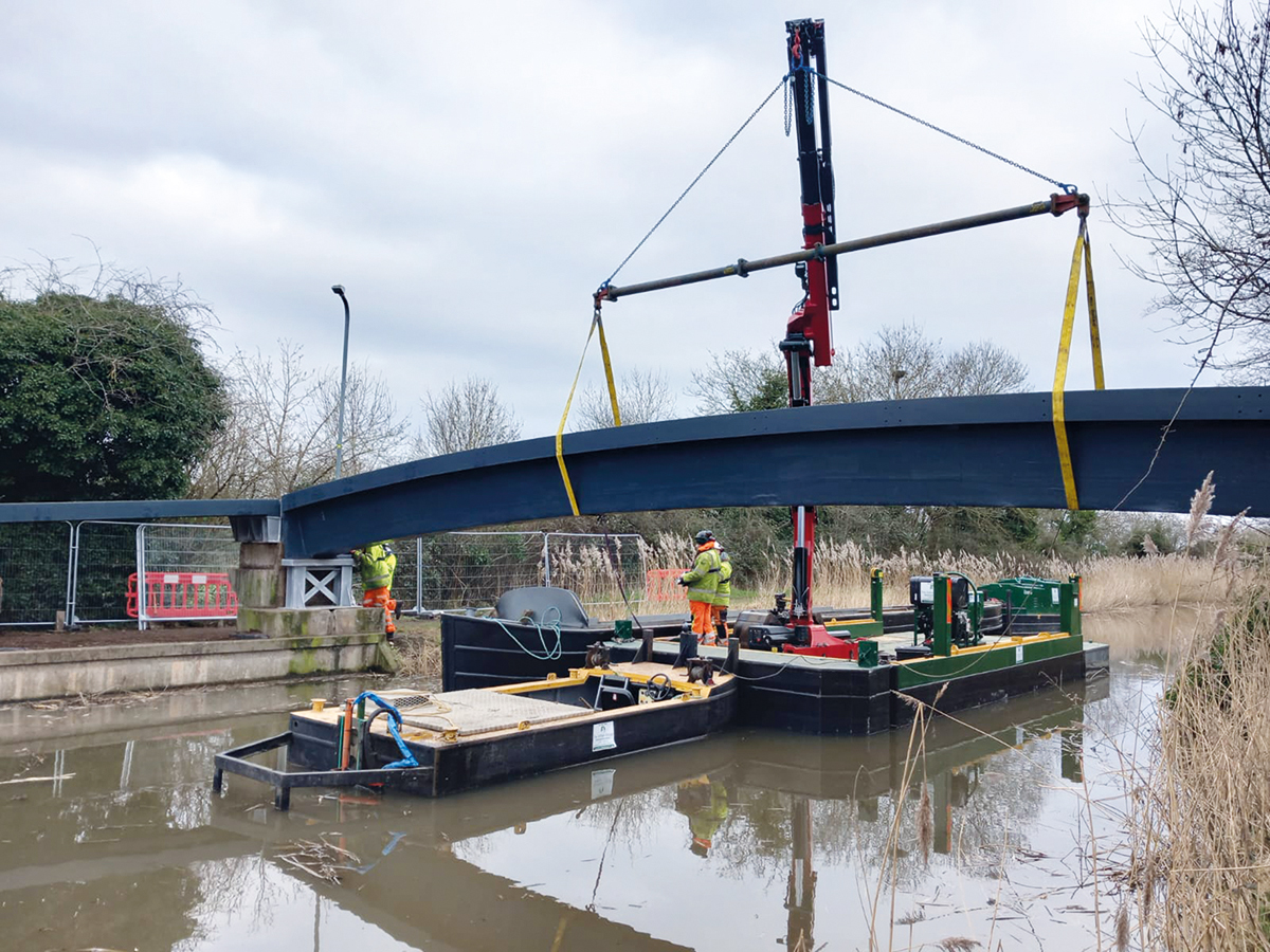 Contractor Griffiths has replaced two footbridges at the Droitwich Barge and Droitwich Junction canals in the Mid-Worcestershire Ring, each weighing 7 tonnes. Waterways specialist Rothen Group provided an 8 metre crane pontoon to create a stable working platform.