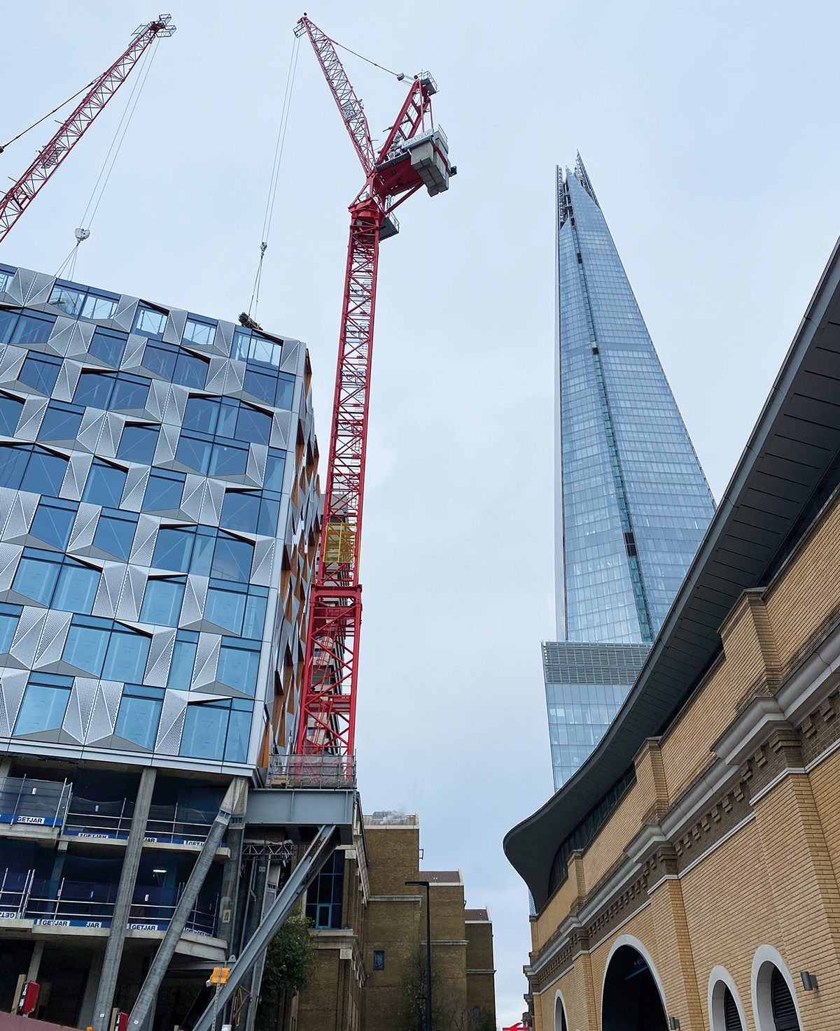 A ‘floating crane’ is aiding construction of a student accommodation tower by London Bridge station. The crane sits on steelwork which extends off the building structure to save space. Mace is building the project for Greystar.
