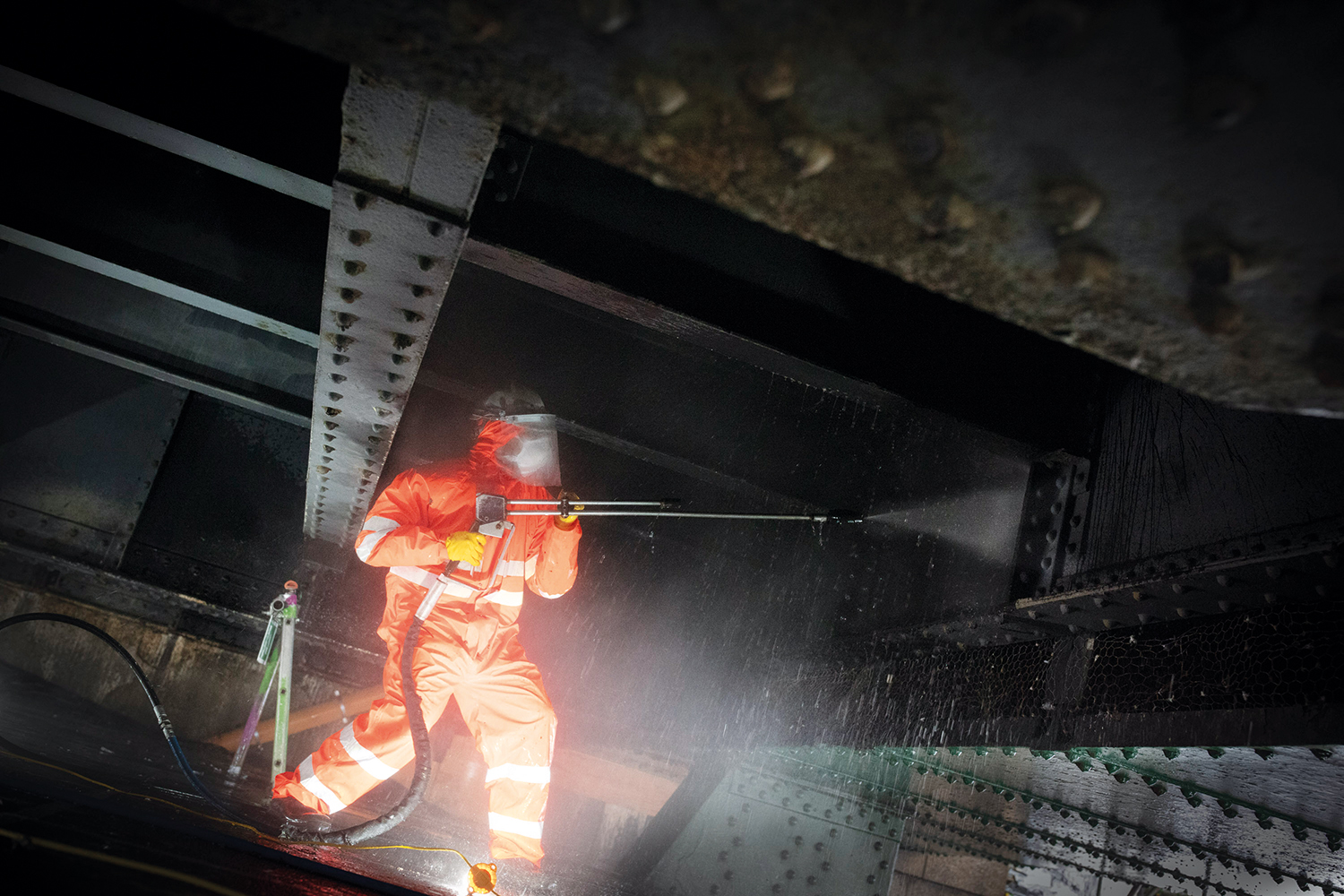 An Esh Construction operative undertakes a cleanup operation under the footway of the Tyne Bridge. The bridge hangars of the famous structure in Newcastle upon Tyne are undergoing essential repairs.