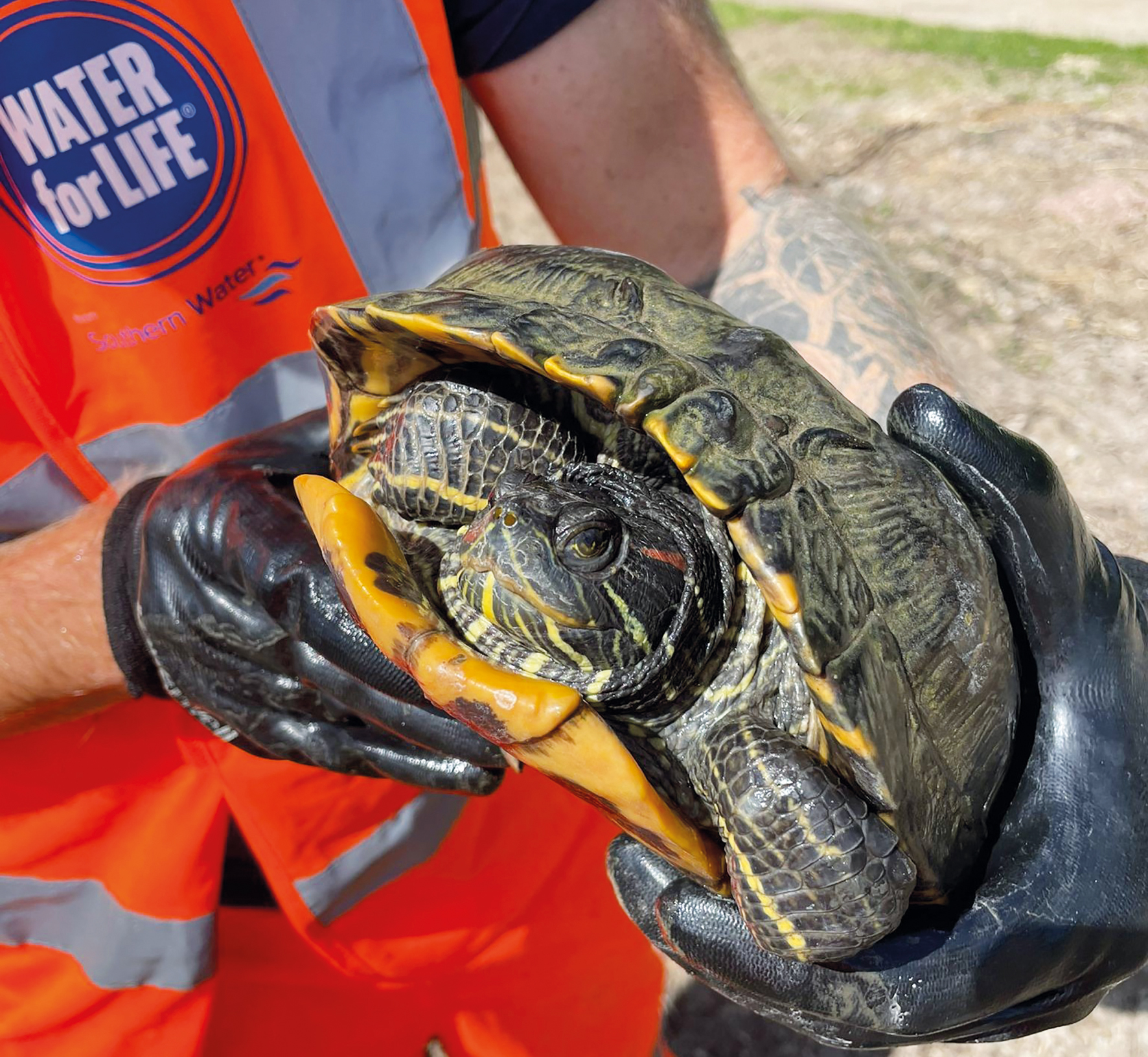 A red-eared terrapin native to southern North America was rescued by a Southern Water ecologist at a river extraction site within the Testwood Water Supply Works in Southampton. Terri was rehomed by Project Terrapin at Raystede Centre for Animal Welfare.