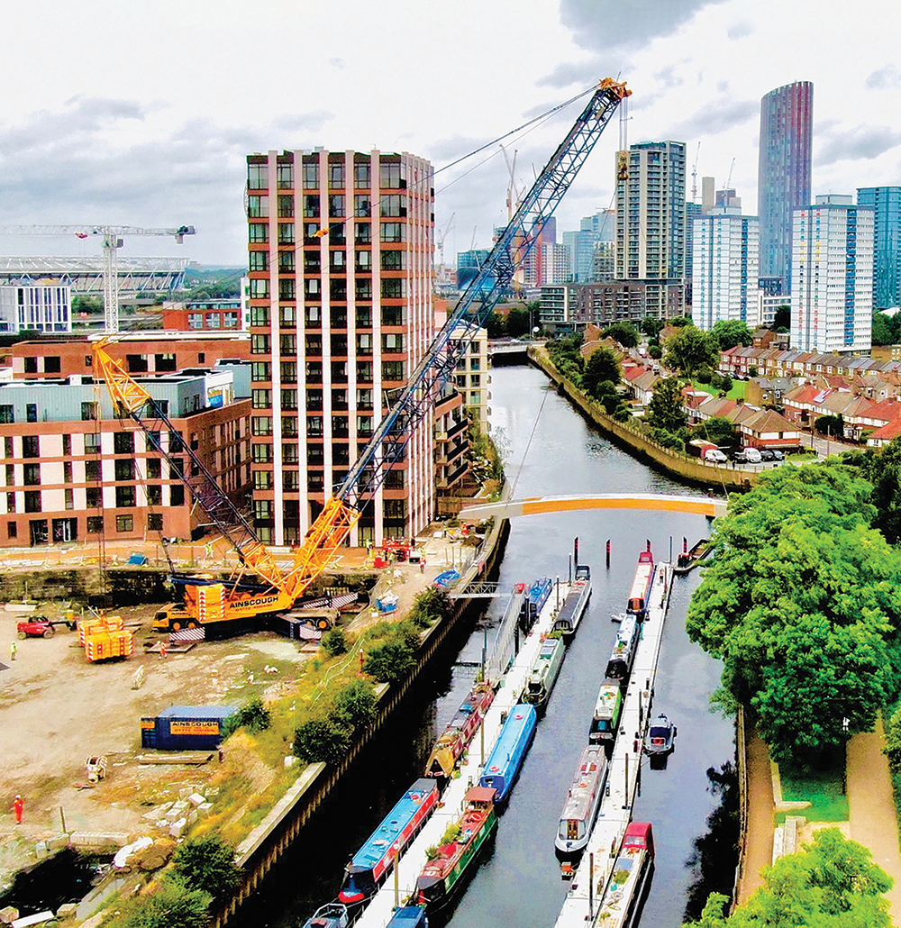 Ainscough Crane Hire’s heavy cranes team has installed a new bridge at Sugar House Island, a canal-side neighbourhood in London. The 38m Matilda’s Bridge, built by Wood Beton, is a prefabricated, concrete and glulam structure. It was built in a factory in northern Italy and transported in large sections to the Sugar House Island development.