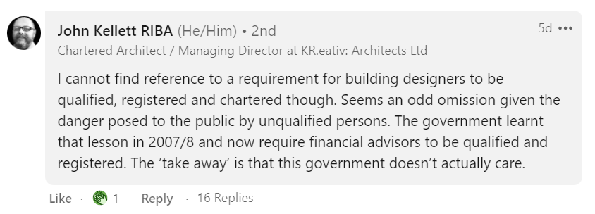 RIBA chartered architect John Kellett raised concerns in a LinkedIn comment about the vague qualification requirements for those who design buildings. Further down the post thread, Kellett pointed out that building regulations in other countries such as Australia, Canada and New Zealand require building designers to have a qualification.