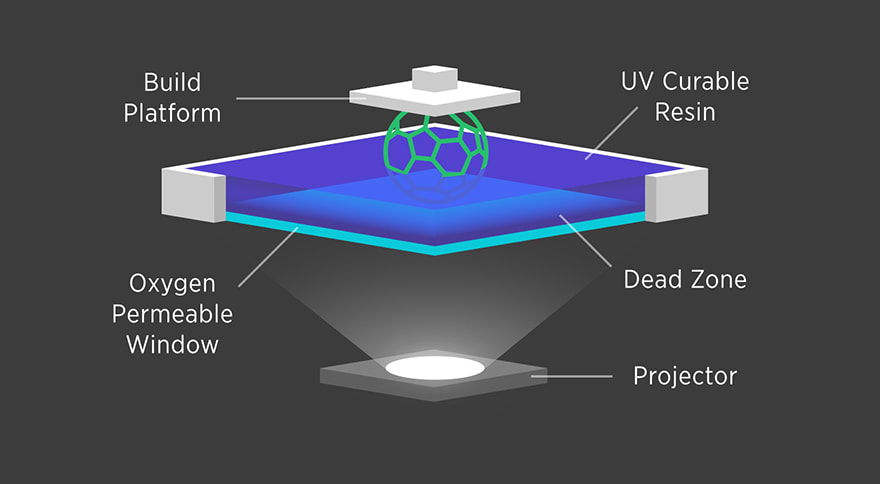 Instead of printing objects layer-by-layer like a traditional 3D printer, a shape is formed by projecting light through an oxygen-permeable window into a reservoir of UV curable resin. The build platform lifts continuously as the object is grown.