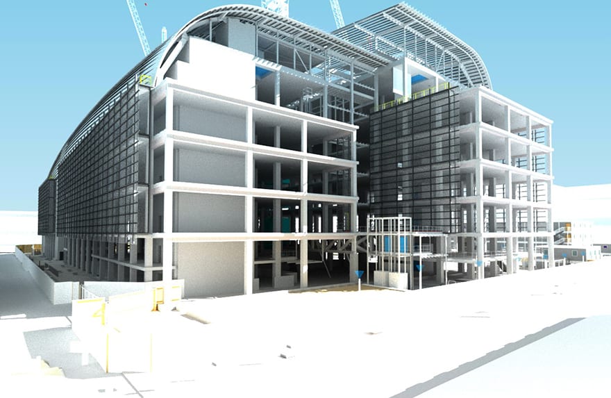 The fully federated model, created in Navisworks and managed in-house by Laing O’Rourke, incorporates the original architectural, structural and MEP authored models in Revit, all subsequent design and construction changes, plus other models added as subcontractors made them available.