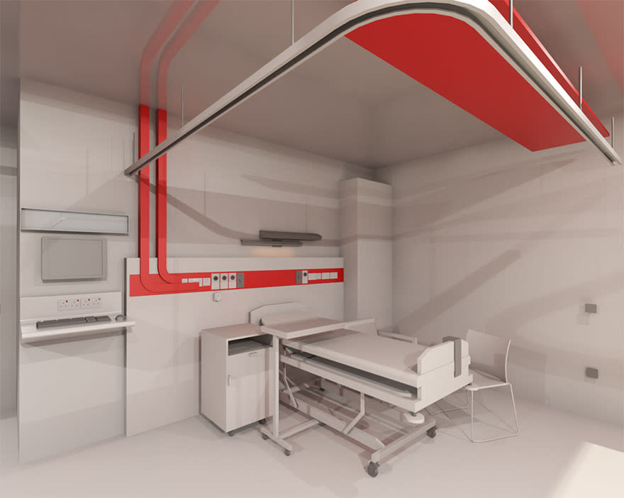 Revit enables clusters of items to be assembled into families, that can be altered outside the project, then reinserted into it. For example, an individual bedroom layout in the hospital, when taken into a family environment, can have different elements rearranged, equipment added or removed. Once loaded back into the main project, all 300 bedrooms update to the same specification simultaneously. This makes the design process faster and more efficient and guarantees that all bedroom elements are identical without the need for checking the model.