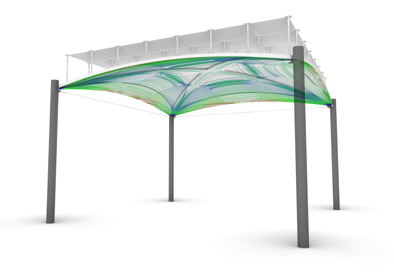 Colours represent the level of stress in the concrete (principal stress). The lines show the direction of the stress (principal stress lines). (Image courtesy of the University of Bath)