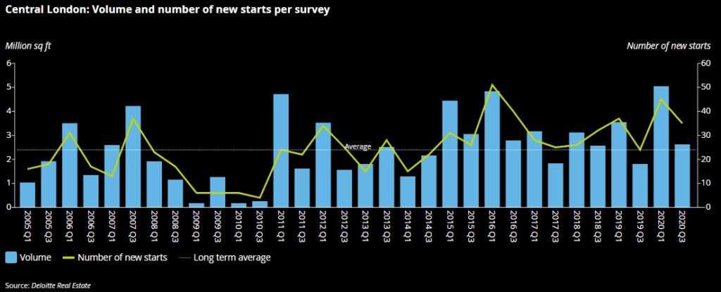 A total of just one million sq ft of central London space was leased in the three months to September, below the 3.4 million sq ft recorded in Q3 2019 as the London real estate market entered what Deloitte called a “state of suspension”.