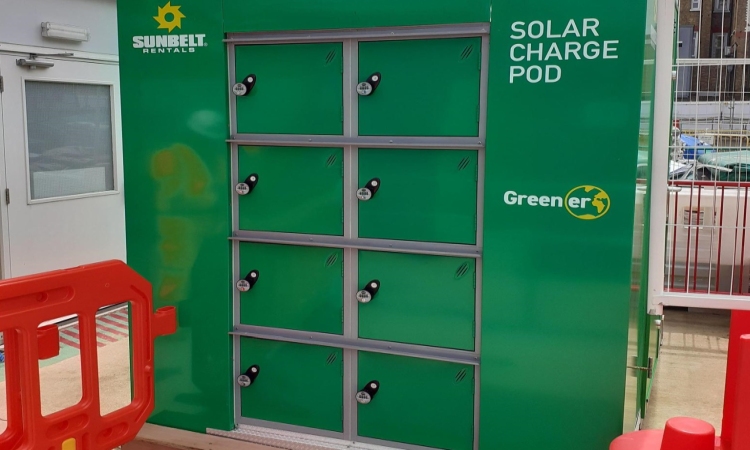 The pod contains 36 individual charging lockers and it was trialled on site for 23 days. Mace Dragados calculated that it saved 4.37kg of carbon dioxide emissions and £1,159 in fuel costs during its use, as compared to a 10kvA generator using 3l of fuel per hour.