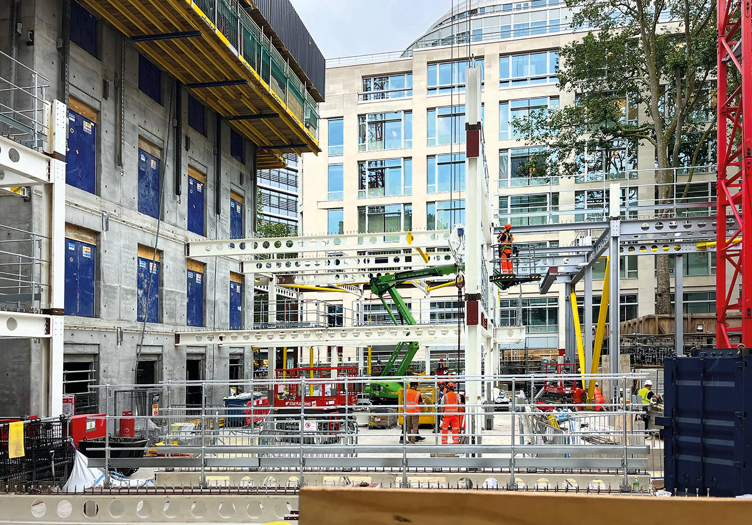 Using the site’s two tower cranes, the steel erection was coordinated around other onsite trades, which earlier in the programme included the installation of the core. During the jump-forming process, Bourne Steel, the supplier of the embedment plates, progressively welded stubs to the plates to accept the frame’s beams.