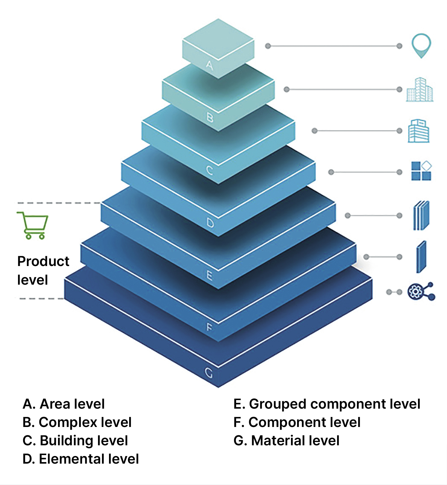 Materials passports are structured as a pyramid, with various levels of passports aggregating and refining data, from capturing manufacturer-provided product details to presenting data for specific building element categories.
