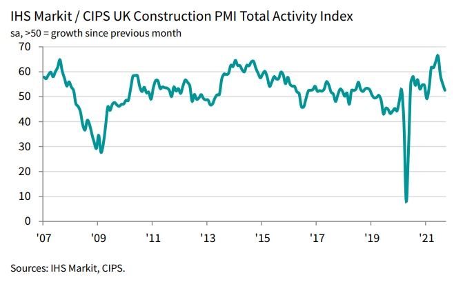 Construction companies recorded a “moderate” increase in new work during the month but the rate of growth fell to its weakest since the start of 2021. There was a strong rise in employment numbers in construction over the month driven by greater workloads, but the rise in staffing levels was the slowest since April, reflecting long wait times to fill vacancies.