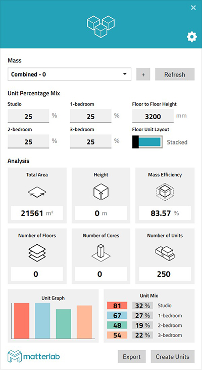 Matterlab’s plug-in aims to accelerate the assessment and reassessment process, giving users a high level interface to alter the mass then instantly recalculate the unit mix and floor layouts in Revit.