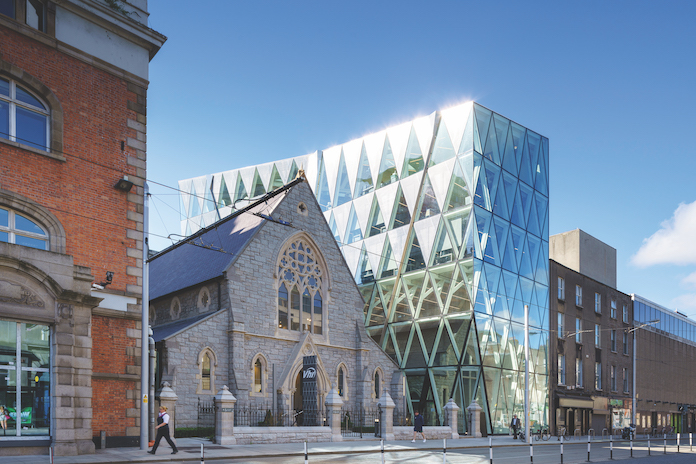 The project planned to incorporate the existing church hall within the belly of a new innovative and contemporary diagrid exoskeleton office block with a unitised curtain wall envelope. Scots Church was a protected structure and the primary challenge for me was to respect and preserve all the significant historical and architectural heritage of the church, while meeting the client’s specific requirements. Fully integrating both the church buildings into the overall envelope was a demanding challenge.
