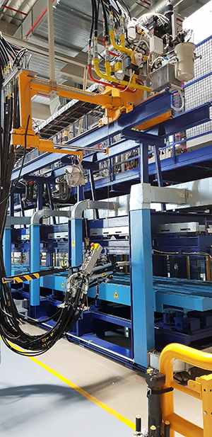 A 3D injection machine pumps carbon fibre-reinforced polyurethane foam into panels