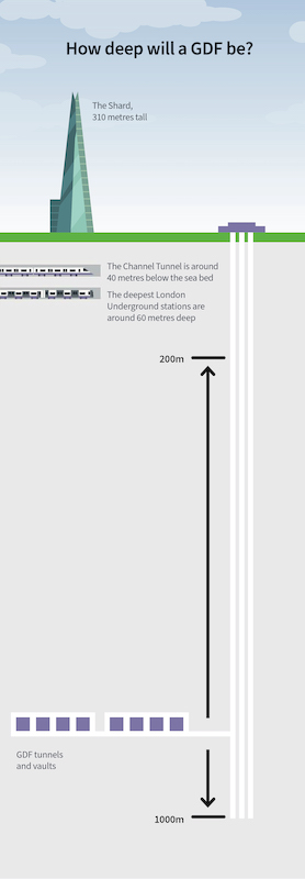These facilities are designed to dispose of radioactive waste in highly engineered vaults and tunnels. They are housed within suitable geology potentially three times deeper than the UK’s tallest building, the Shard in London.