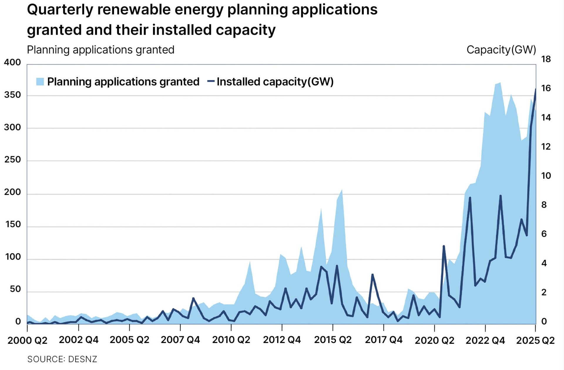 The following chart (below) illustrates the sharp 563.3% increase in granted renewable planning applications between 2020 Q2 and 2025 Q2, leading to a combined capacity of 110.2 GW.