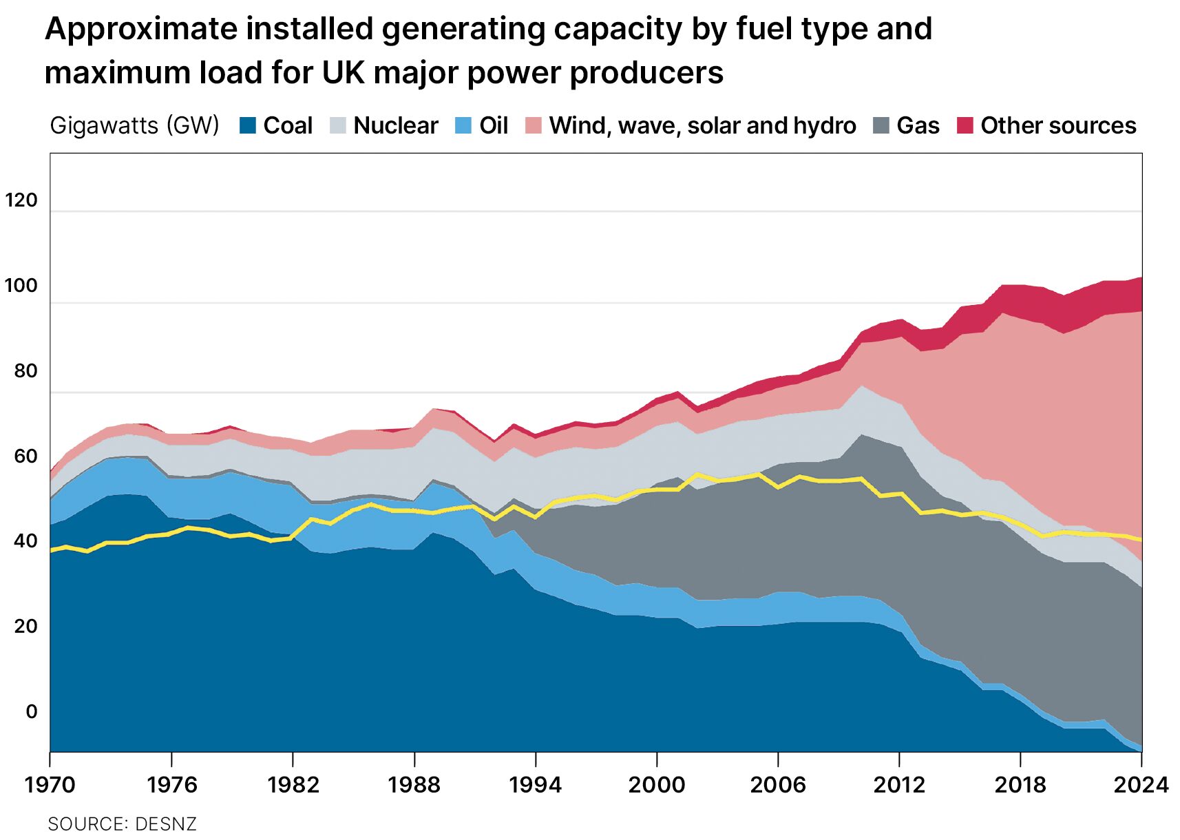 Over the past decade, installed generating capacity in the UK has consistently risen, driven by the expansion of offshore wind, solar and battery storage. By contrast, the highest level of electricity demand that was successfully supplied by major power producers (peak demand) remained relatively flat, due to efficiency gains and changing consumption patterns. The result is a system that, on paper, has more capacity than demand, as the following chart shows (below).