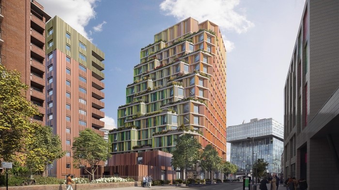 It has been designed to achieve carbon reductions of 40%, compared to the London Energy Transformation Initiative (LETI) ‘business-as-usual benchmark’. The building extract waste heat from the Tube station below to help heat it and will employ next-generation air source heat pumps, solar panels and high-performance building materials, the development will achieve a 44% reduction in operational carbon emissions.