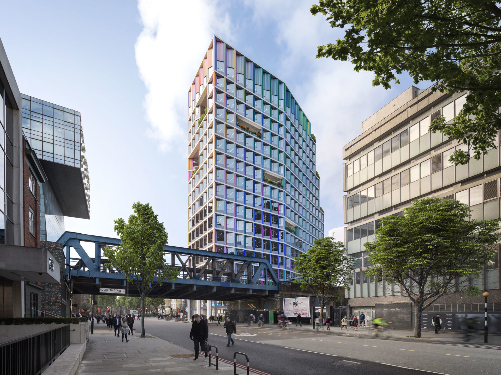 The 17-storey, cross-laminated timber building will sit above Southwark Tube and will retain the station entrance, ticket hall, and lightwells down to the Jubilee line platforms.