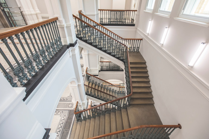 The project has also restored the original terrazzo flooring, oak panelling and wrought iron balustrades in the dark grey of the original colour scheme. Ironmongery for new doors has been matched with retained doors, radiators have been painted and the original glazed tiles re-exposed in the lower levels.