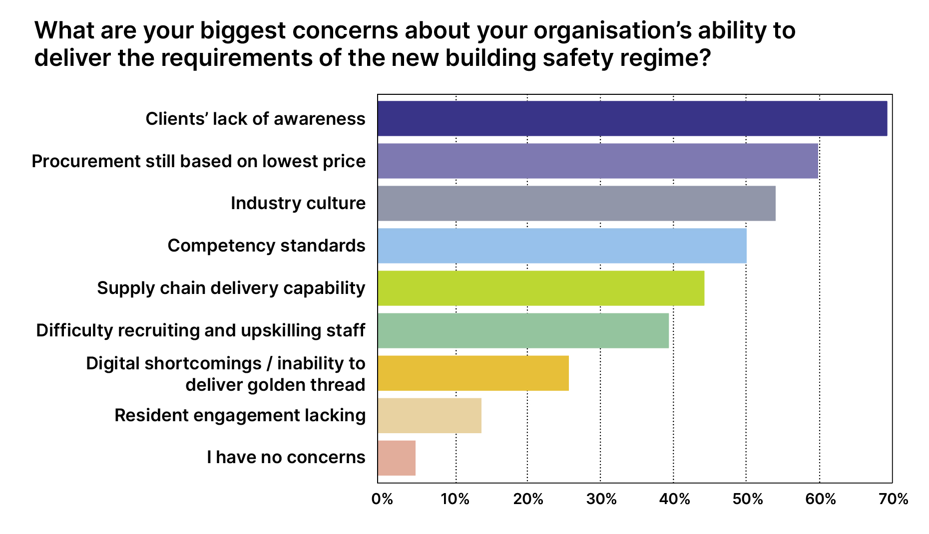 When it came to respondents’ concerns about their organisation’s ability to deliver the requirements of the new building safety regime, clients’ lack of awareness was cited as the biggest obstacle (68.9%).