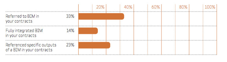 In other findings, only 23% of respondents referenced specific outputs of BIM in their contracts and only 14% were “fully integrating” BIM into their contracts, suggesting that the industry’s legal practice hasn’t caught up with BIM adoption.