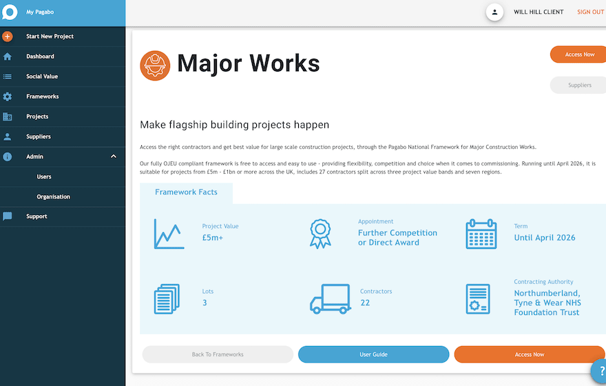 Clients can view the frameworks available to them and digitally sign the client access agreement for others within the platform. They will also be able to see all of the suppliers available to them, with each one having an individual profile showing the key company information, case studies and good news stories.