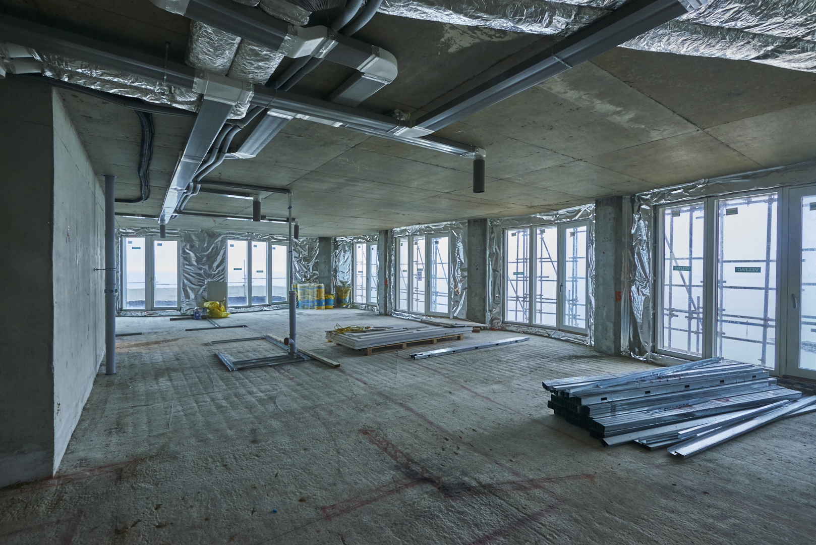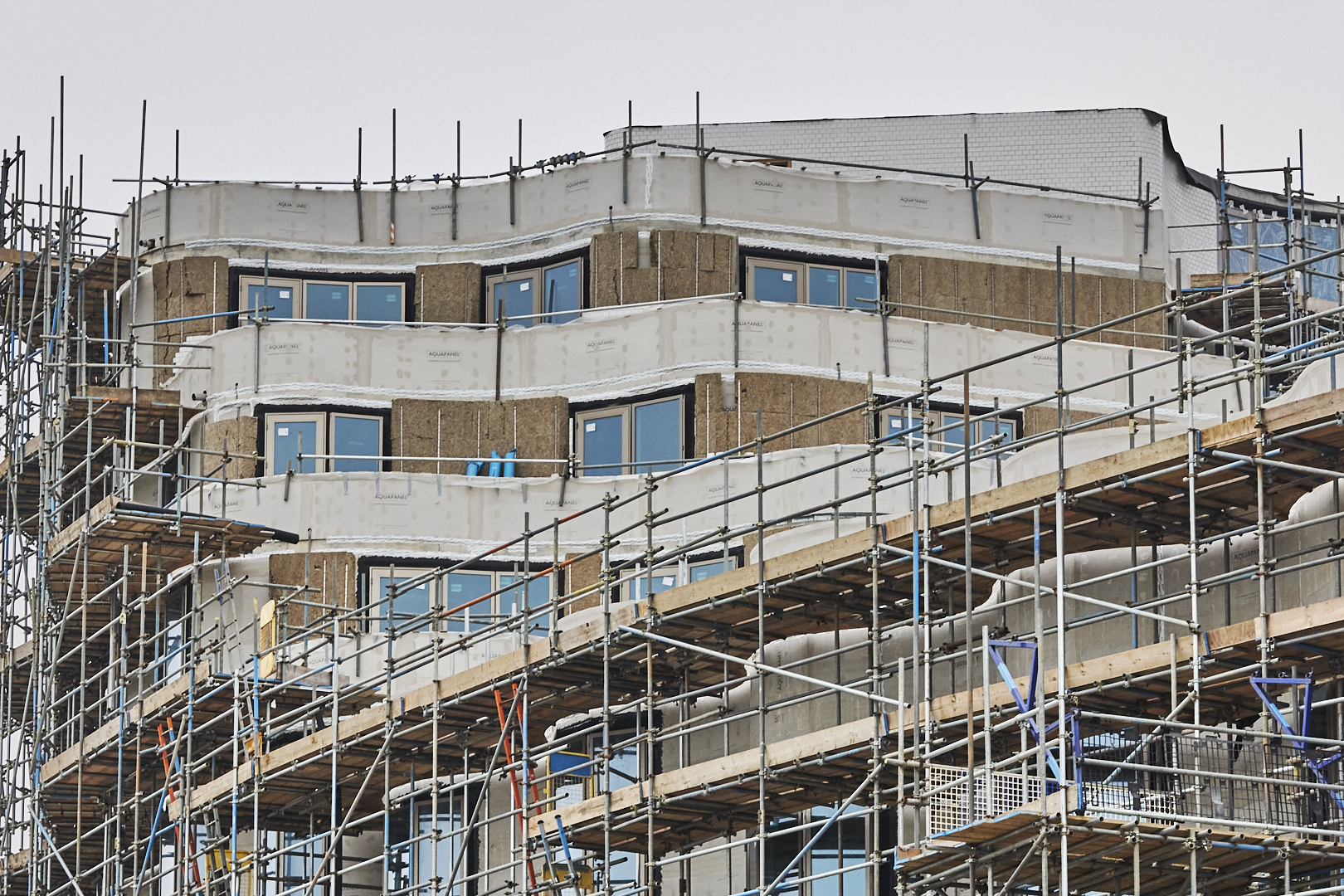 The development also includes an under-croft car park that allows natural daylight in with openings in the ceilings, as well as featuring EV charging points. Inside, communal areas are being clad with acoustic walls and terrazzo floors.