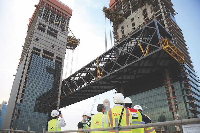An 8,000 tonne, 227m-long cantilever whose structural steel weighs more than the iron in the Eiffel Tower, has been lifted into place to join together two towers in Dubai.