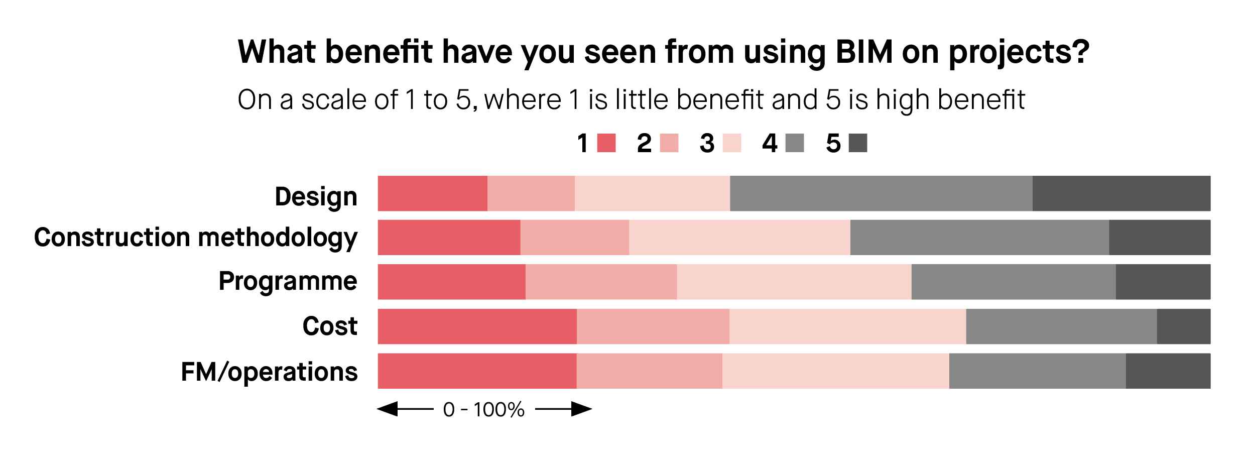 Across the sector, BIM is acknowledged as moderately useful for construction methodology, programming and cost control. In the FM sector, which has historically been slower to adopt BIM than construction, as many as nearly one-third (31%) have found BIM to be useful or very useful on projects.