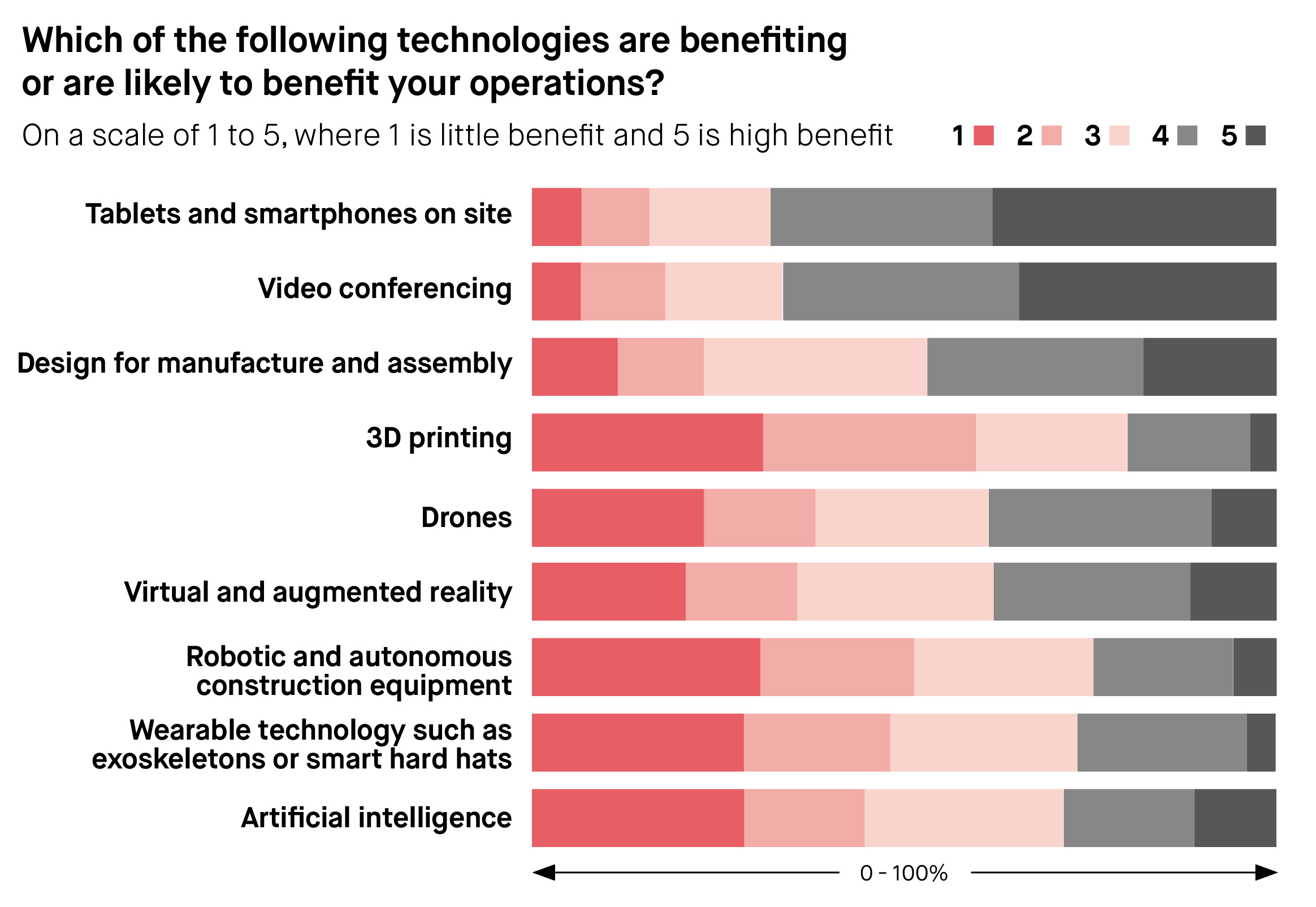Indicating that virtual and augmented reality (VR and AR) has started to come of age, 38% said it is of high benefit in onsite applications.