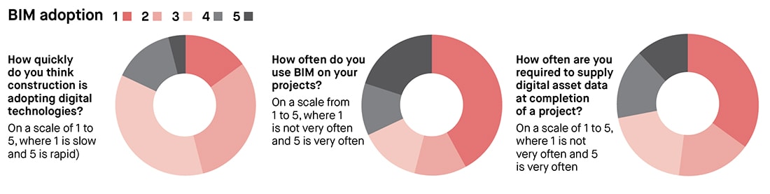 Digital technologies have not been embraced at pace across the sector according to 45% of respondents, with only 3% saying construction is ‘going digital’ rapidly (scoring five on a scale of 1-5). Nearly four in 10 estimate the pace of digital uptake as moderate, scoring it 3.