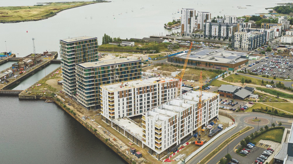 These projects included the Chatham Waters development for Russell WBHO, a two-block, seven-storey residential development in Kent of 193 apartments. The frame comprises structural walls and solid hollowcore flooring, with a facade of white etched precast concrete with bronze panels and balconies.