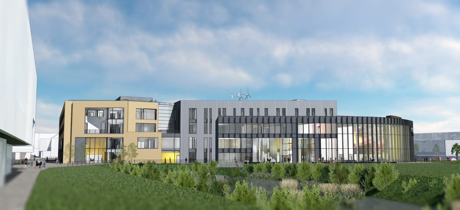 ARCHICAD model showing view of the main entrance looking east across the Delph Pond