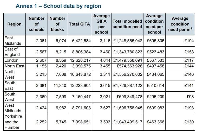 Schools in the South East and West Midlands each have £1.7bn of condition need, the highest in the state. Schools in the North East have the lowest total condition need, with below £600m.
