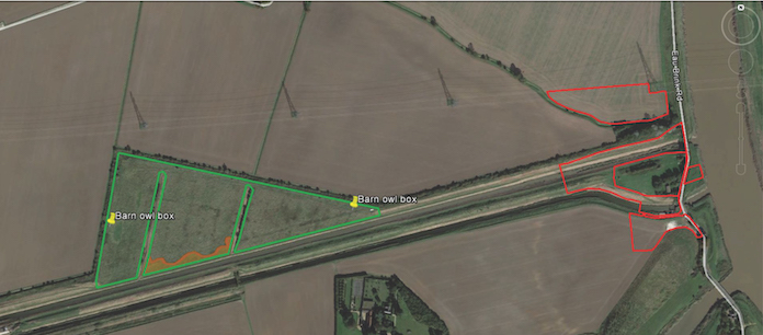 Location of the biodiversity net gain areas: enhanced grassland (in green); reedbed creation (in orange); barn owl boxes (yellow); plus the location of the pumping station (red)