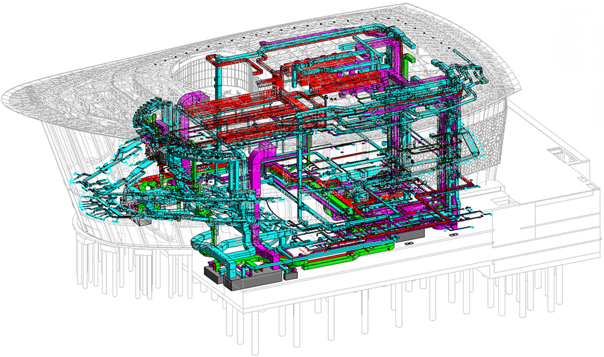 The compact building space, dense steel structure and large number of moving elements inside (including floors, walls and ceilings designed to transform into different modes to host opera, theatre, concert and flat-floor exhibitions) required extreme attention to detail to ensure the feasibility of MEP service routes.