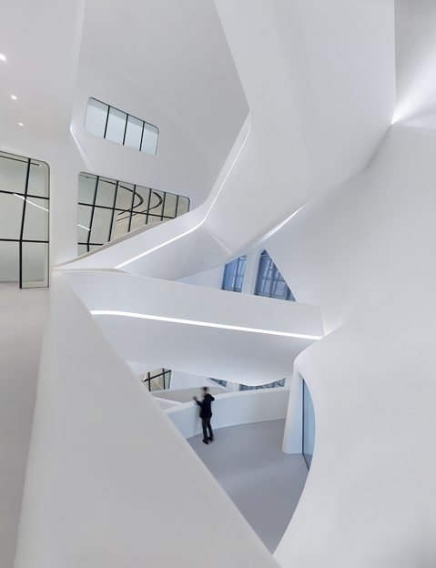 It is a showcase for the late Zaha Hadid’s characteristic fluid geometries, built in a mix of concrete, aluminium, steel or stone, with the cladding alone comprising 30,000 m sq of flat, single-curved and double-curved panels.