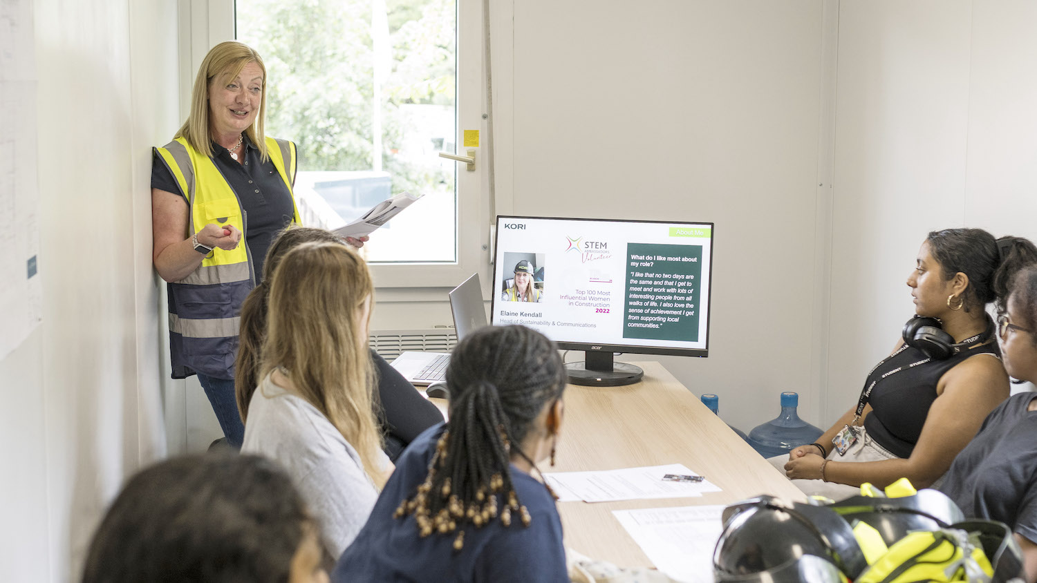 Elaine Kendall gives a careers talk and site tour at Kori Construction’s 63-bedroom care home project in Harpenden for students from nearby Parmiter’s School