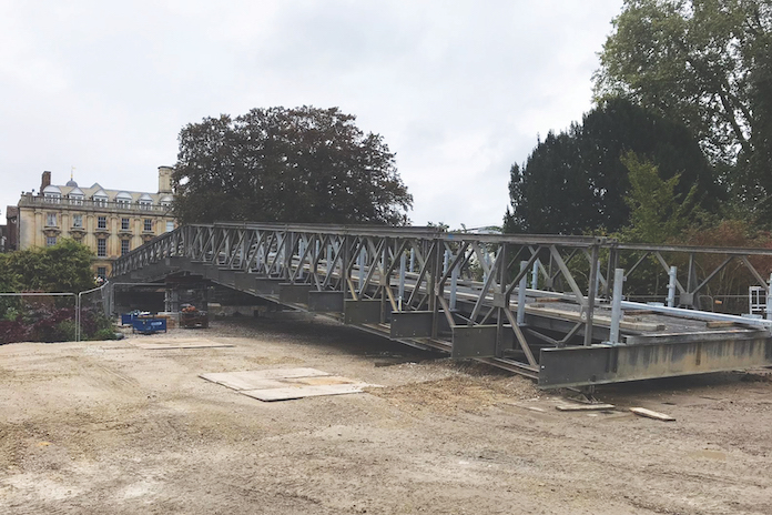 The 57m long bridge, which was built and craned into place overnight by Mabey, now sits between the Garret Hostel Bridge and Clare College Bridge: the oldest bridge in Cambridge. This means that for the first time since the 1960s, the Middle River of the Cam between mill pond weir and Jesus Green weir has 10 bridges, rather than nine (excluding other construction works that we are unaware of, of course!) Now this phase is complete, plant and machinery will be able to access the Master’s Garden at the back of Old Court, the heart of Clare College, to start work in earnest.