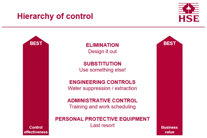 The Health & Safety Executive’s (HSE) hierarchy of control (above) looks at the effectiveness and business value of five different approaches, with the top classed as ‘best’ practice followed by the ongoing steps to mitigate risk. It is a methodical path that should be used with any task that will create dust.