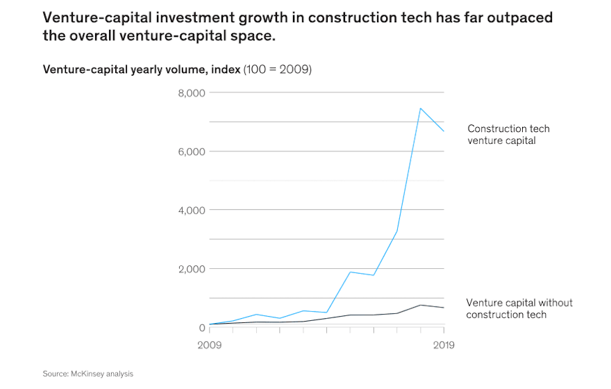 The growth of VC investment in construction technology has far outstripped the growth of the overall VC sector; indeed, in 2019, VC investment in construction technology grew 15 times faster than the overall VC sector.